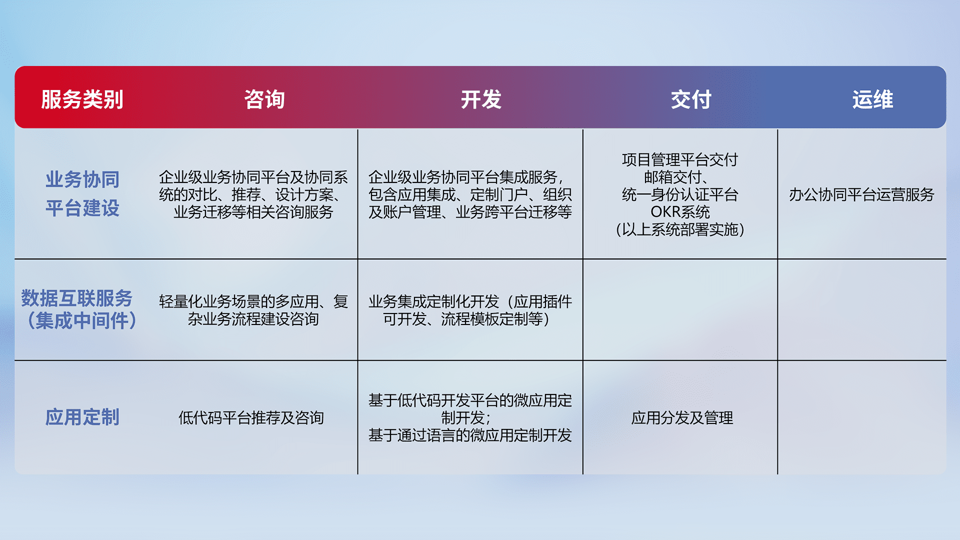 针对钉钉、、、企微、、、、IDaas等平台级产品提供产品的规划、、、方案、、、交付、、、、定制化开发等服务,,实现如统一协同办公、、智能客户服务、、混合会议管理、、智能数据查询、、等业务场景,,,实现数字化转型。。